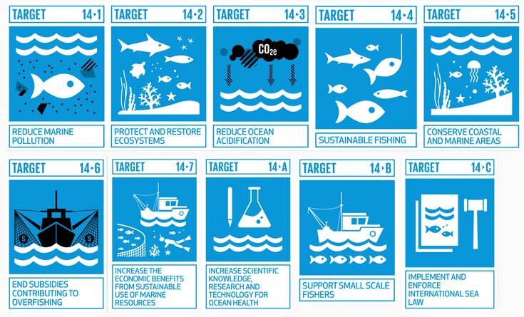 The aim of SDG 14 Life Below Water is to conserve and sustainably use oceans, seas, and marine resources, reducing pollution and protecting coastal ecosystems. It includes protecting habitats, reducing plastic waste, and sustainable fisheries.